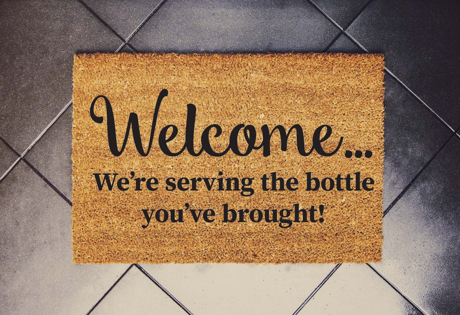 Fußmatte mit einem lustigen Zitat „Willkommen, wir servieren...“