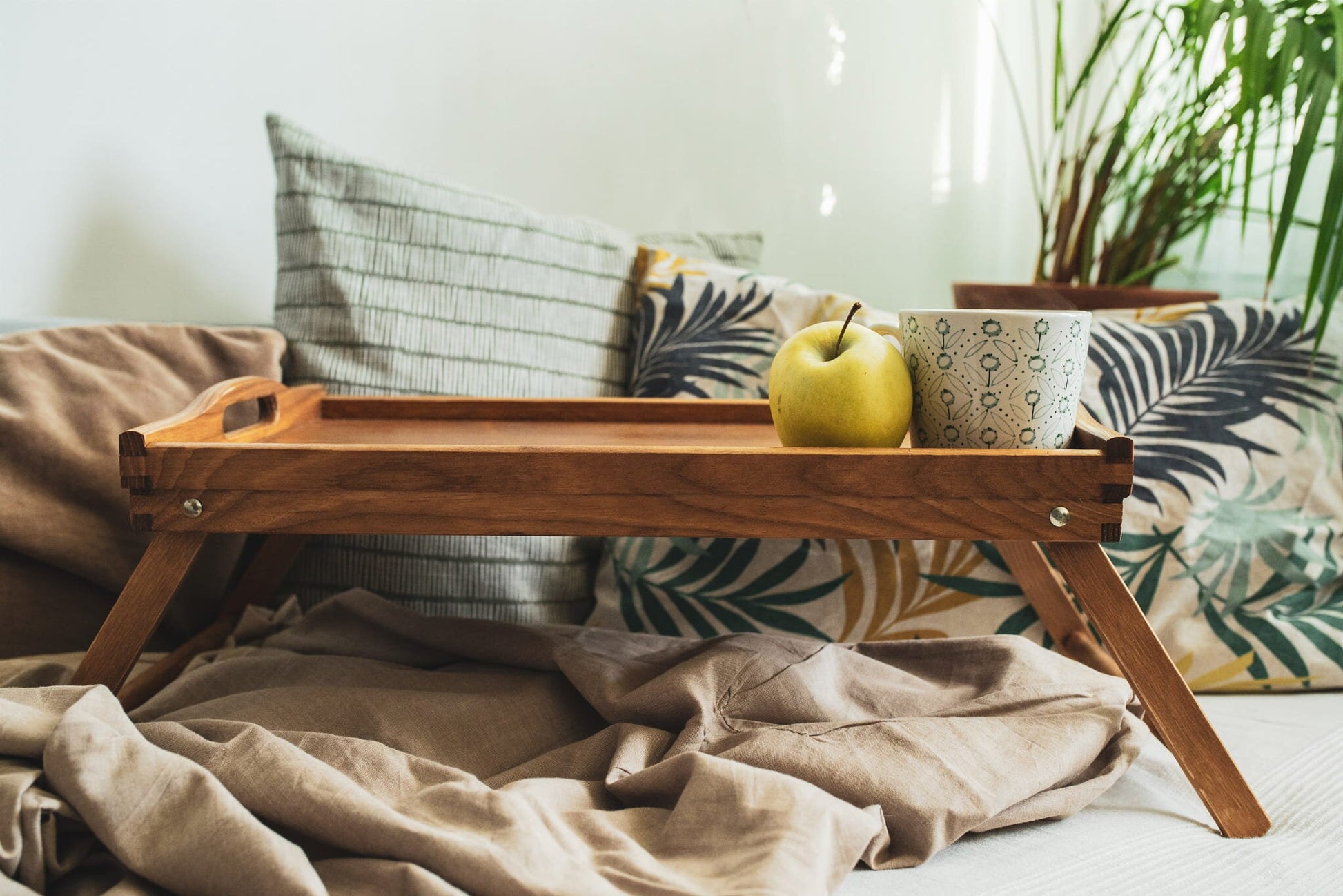 Ein Tisch aus glatt lackiertem Kiefernholz. Zusammengeklappt als Tablett.
